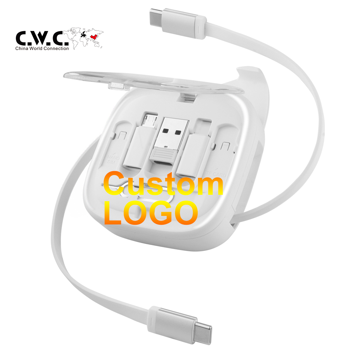 Il Cavo di ricarica multi USB in PVC può essere realizzato in qualsiasi forma o dimensione con un logo in pvc personalizzato in 2d o 3d. Wcon 4 cavi compatibili con iPhone, Samsung, Android e molti altri dispositivi elettronici, questo regalo promozionale è perfetto per collegare tutti i tuoi dispositivi a qualsiasi prodotto USB.